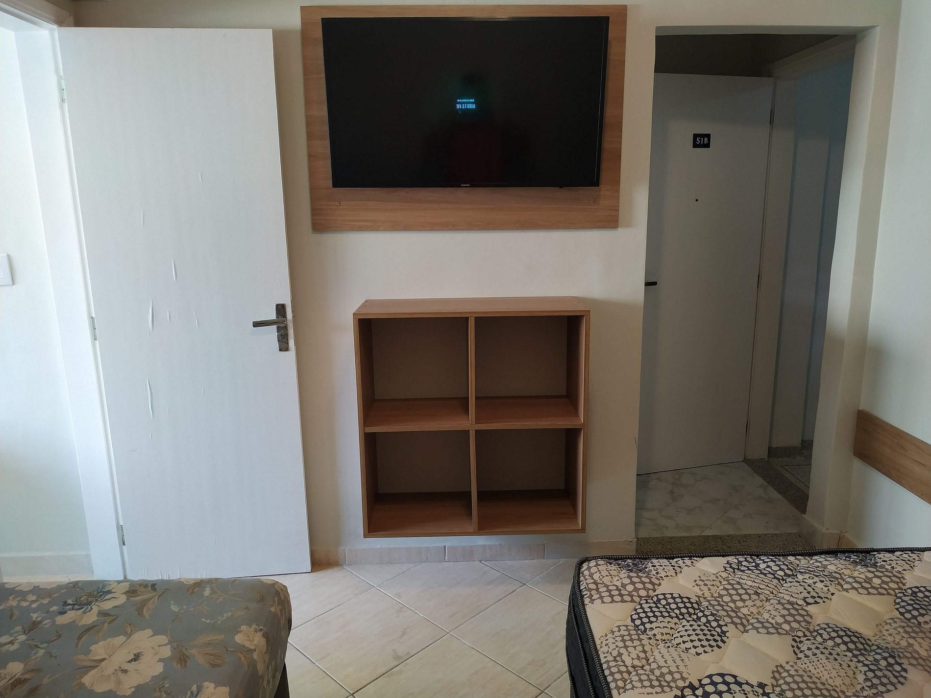 O kitnet 51 B fica no prédio Ed. Guariatã no quinto andar e dispõe de elevador para até 300 kgs. No apartamento de aproximadamente 22 m2 tem 1 cama de casal, 1 cama de solteiro, tv smart, wifi gratis, nesta tv tem acesso a youtube e netflix. Na cozinha tem uma pia, pratos , copos e talheres, 1 microondas e 1 frigobar e uma bancada com 2 banquetas para se alimentar. O banheiro é privativo e o quarto tem ar condicionado split para o seu total conforto