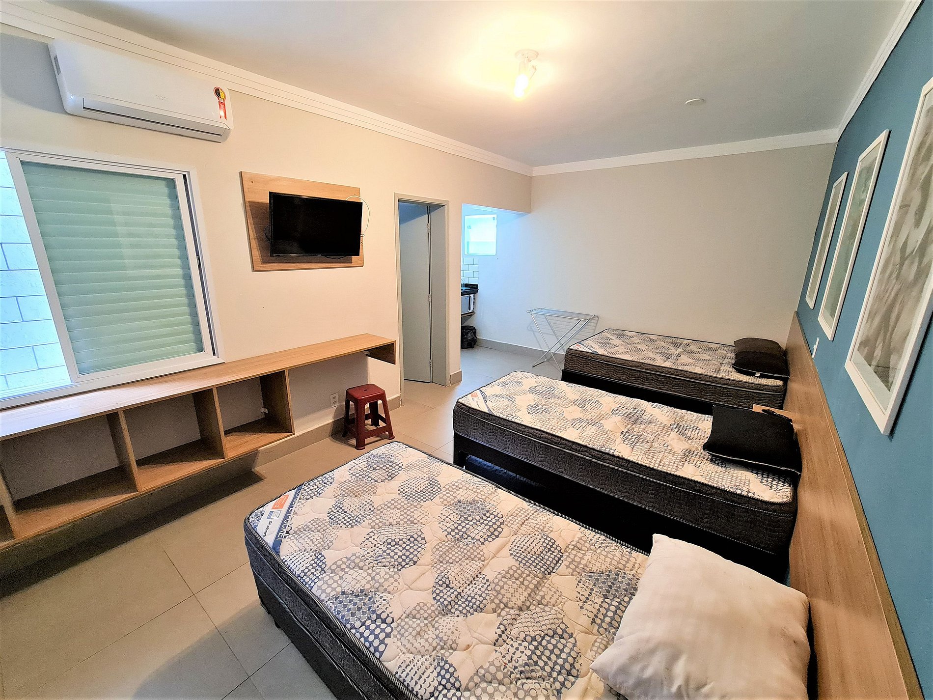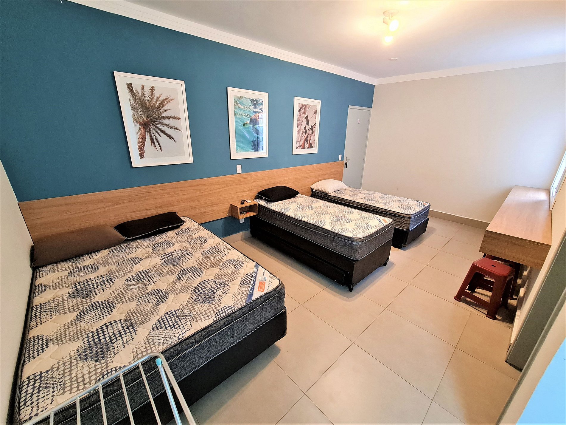 Acomoda 5 pessoas: 1 cama de casal e 3 solteiros.