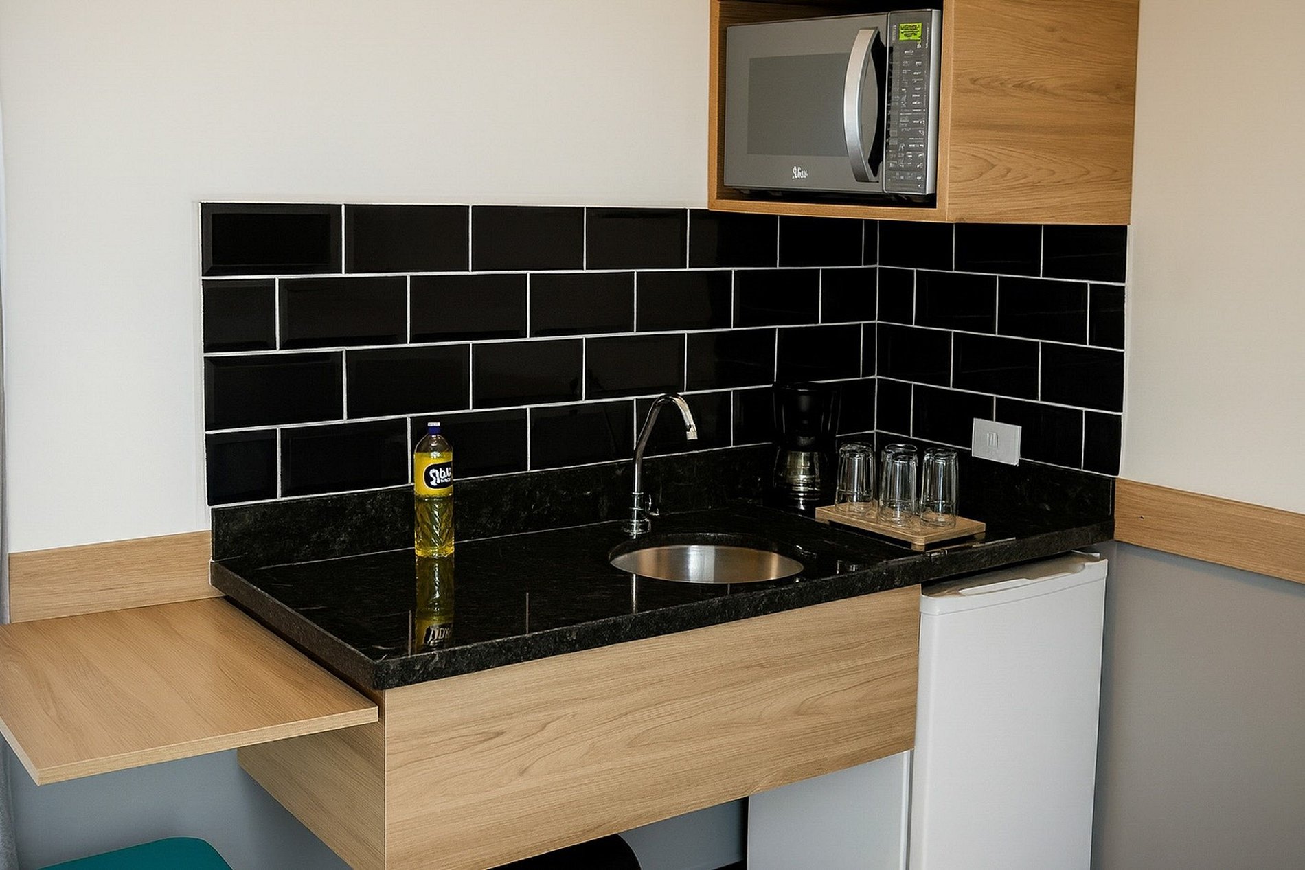 Cozinha compacta com pia, microondas, frigobar e utensílios, perfeita para pedir delivery e economizar com o custo da viagem.