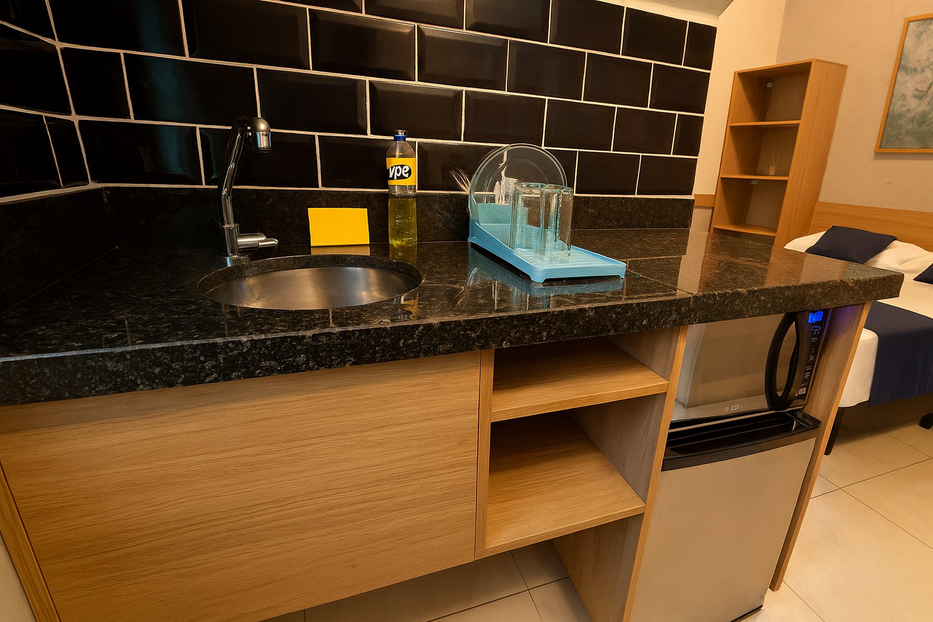 Nosso diferencial é a mini cozinha em todas as suítes, equipada com micro-ondas, frigobar e utensílios. Isso permite aos hóspedes economizar em refeições e desfrutar da conveniência do delivery, tornando sua estadia confortável e econômica.
