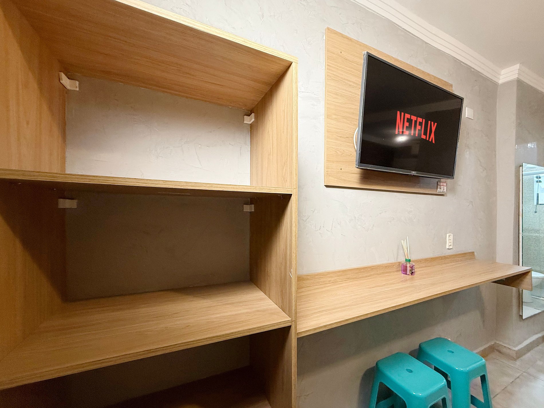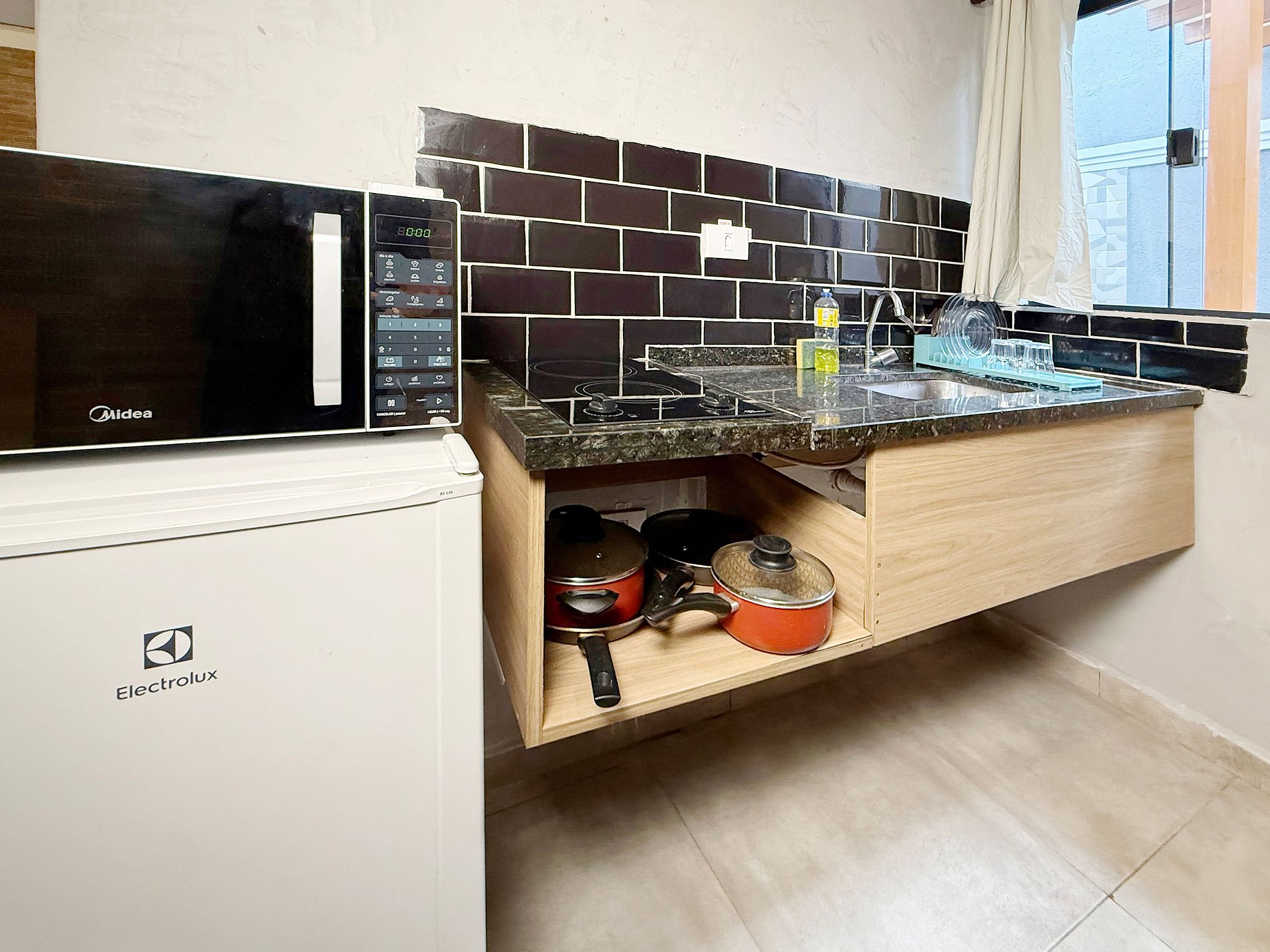 Todas as suítes têm mini cozinha com micro-ondas, frigobar e utensílios. Isso permite pedir delivery ou preparar refeições simples, trazendo mais autonomia e economia pro hóspede — sem abrir mão do conforto.