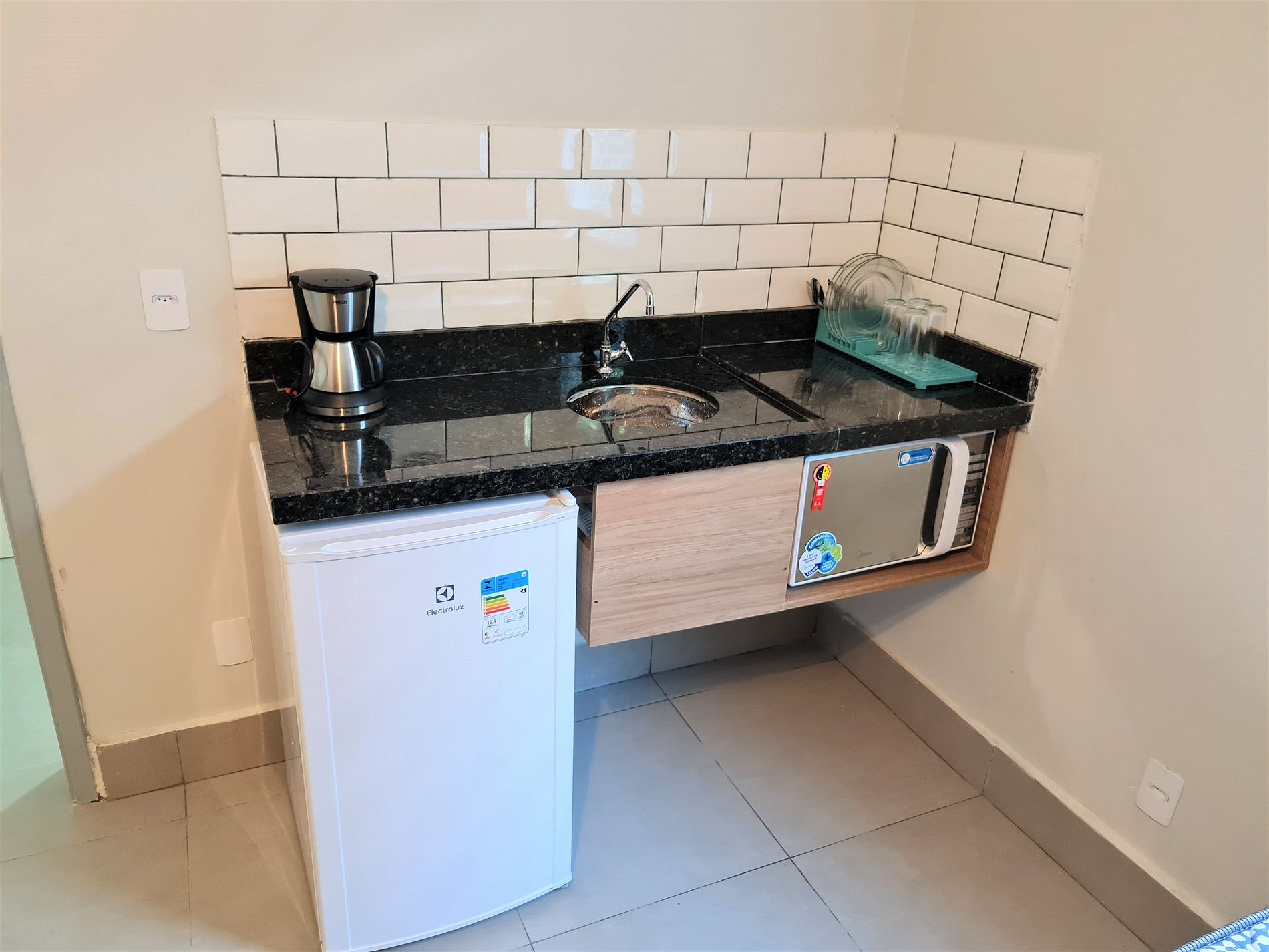 Cozinha compacta com microondas, frigobar e utensílios, perfeita para pedir delivery e economizar com o custo da viagem.