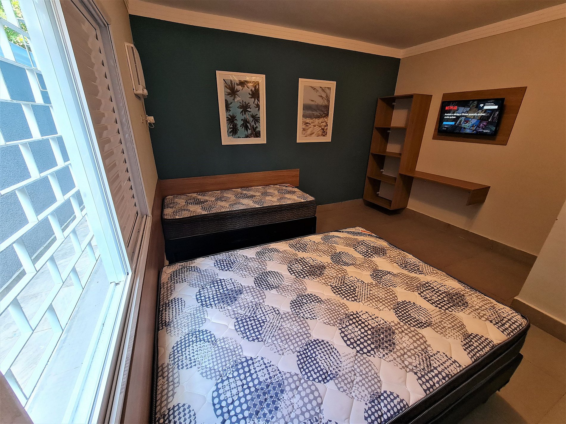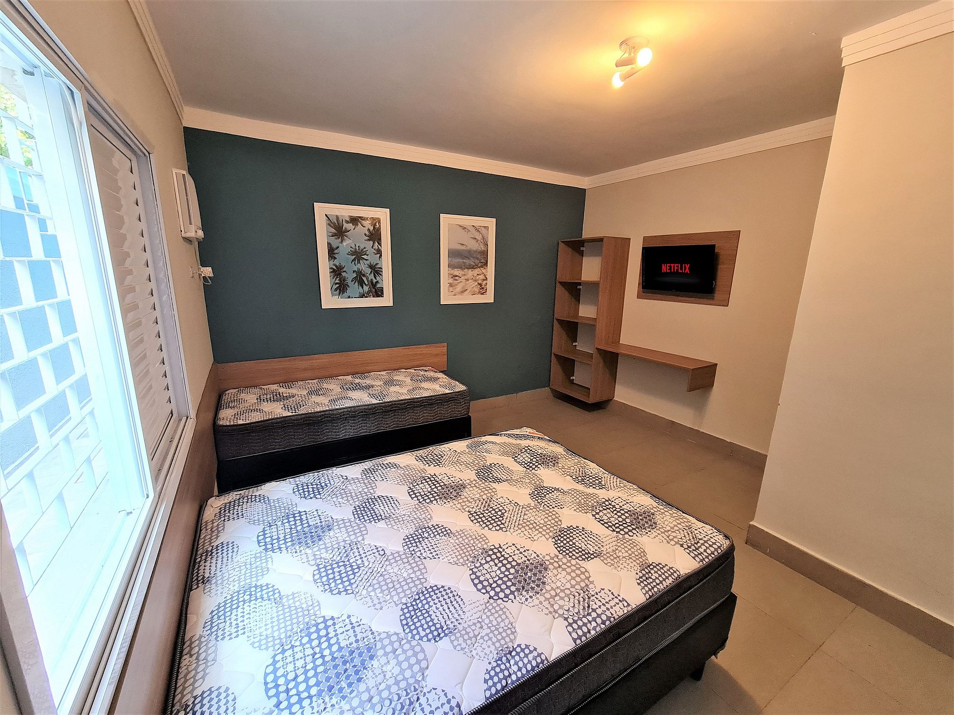 Comodidades modernas: TV Smart, ar-condicionado e Wi-Fi.