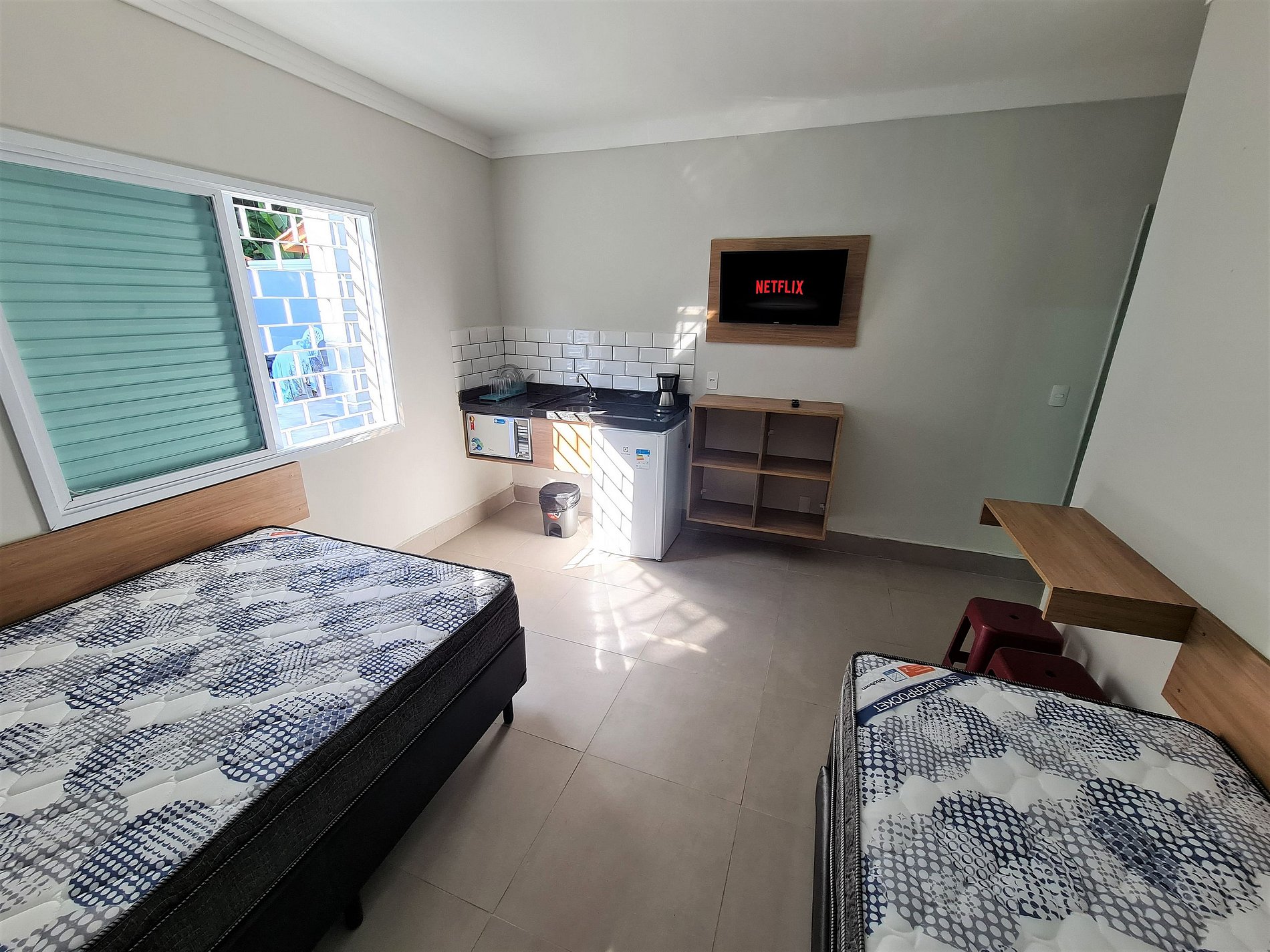 Nosso diferencial é a mini cozinha em todas as suítes, equipada com micro-ondas, frigobar e utensílios. Isso permite aos hóspedes economizar em refeições e desfrutar da conveniência do delivery, tornando sua estadia confortável e econômica.